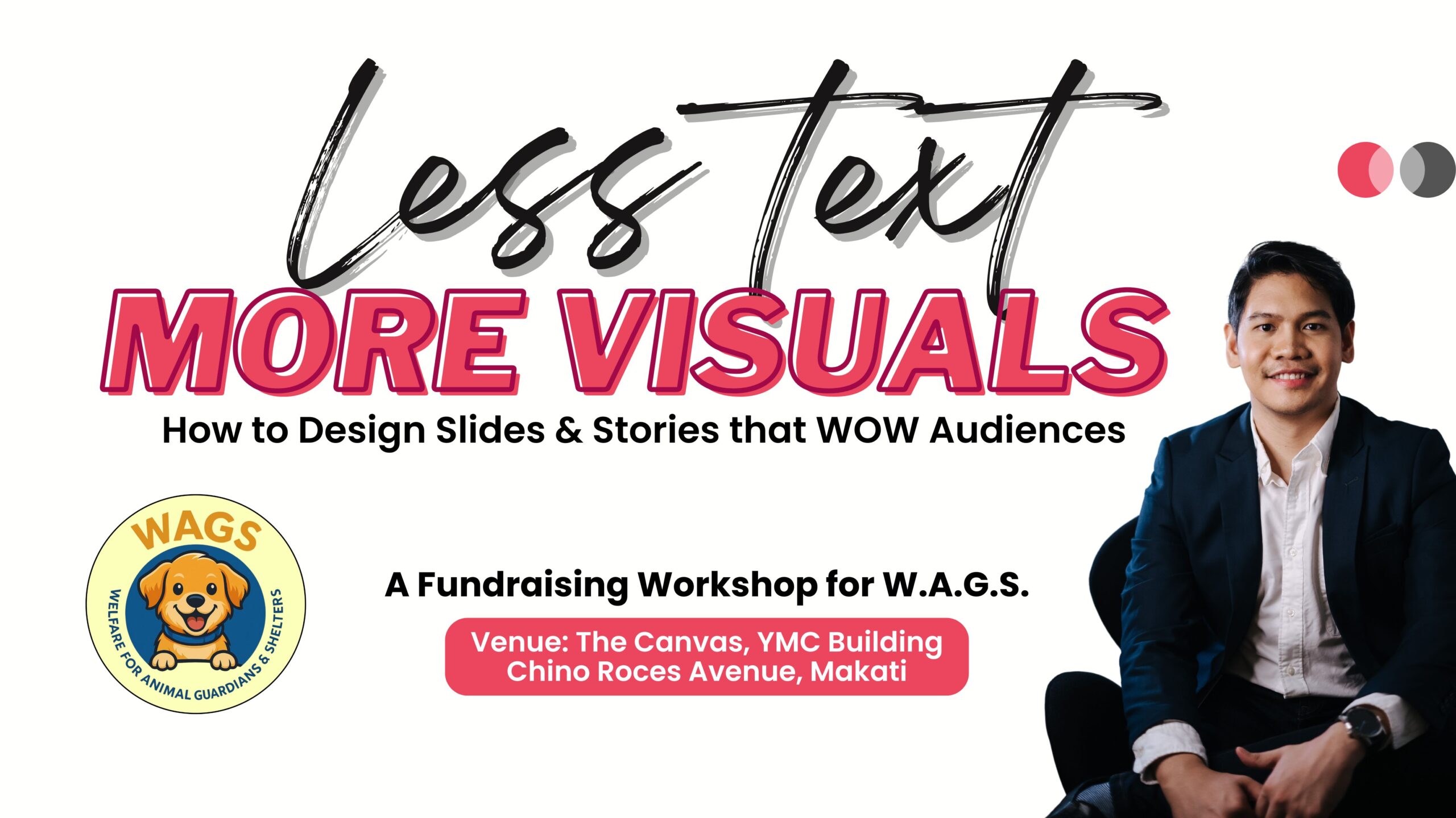 This workshop series is designed as a Fundraising Event for W.A.G.S. (Welfare for Animal Guardians & Shelters) which aims to financially support small dog shelters and volunteer stray feeders all over the Philippines. We thank you in advance for your help!